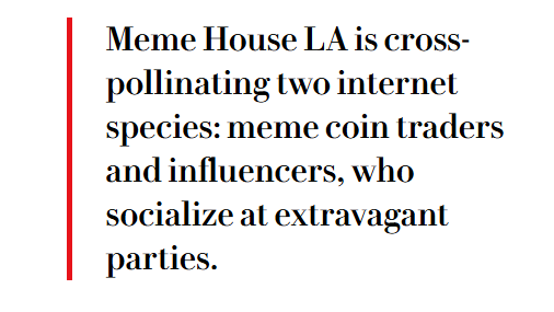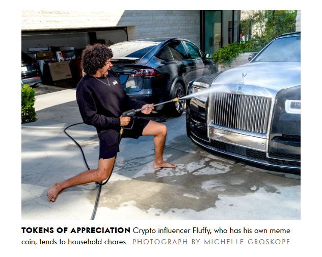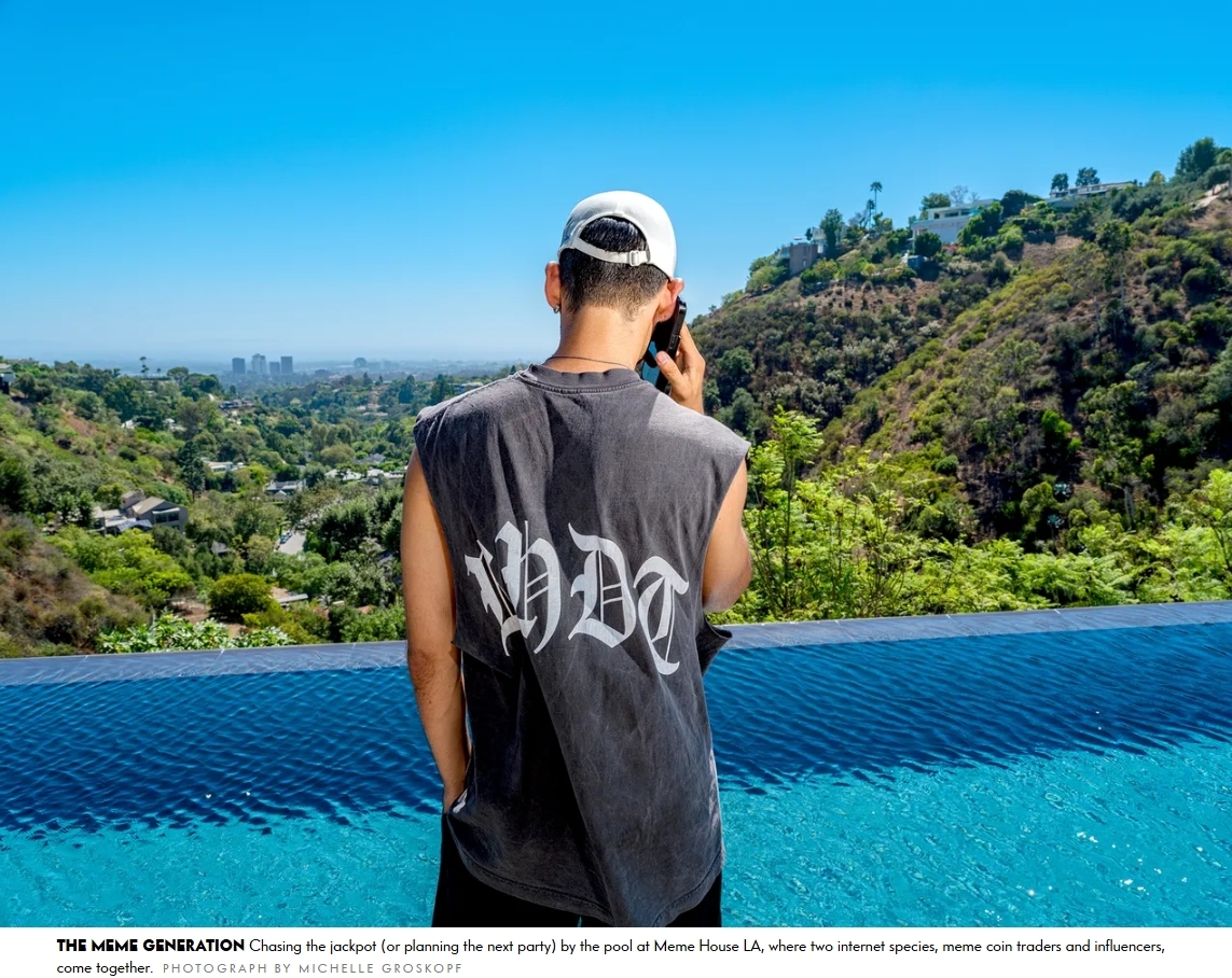 Hossain is dressed in the costume of California comfort: bare feet peeking out beneath white jeans, a tan polo spun from natural-looking fiber, and, on his wrist, a Rolex. Hossain says he made his fortune in crypto currencies like Bitcoin. Out in the driveway sit two Lamborghinis, a Ferrari F8 Tributo, and a Rolls-Royce. Everyone always says, I wish I got into Bitcoin back in the day when everyone was making money, states Hossain. But with meme coins, we see those kinds of returns every single week. Meme House LA and its occupants represent one of the stranger phenomena of the postpandemic internet: the emergence of a financial ecosystem cobbled together from Telegram group chats, Discord channels, and Twitter DMswhere millions are made and lost by people who in a previous era would have had little access to or interest in the markets. It is all centered on an asset that has no clear function or utility. But it is powered by the most valuable tender on the planet: attention.