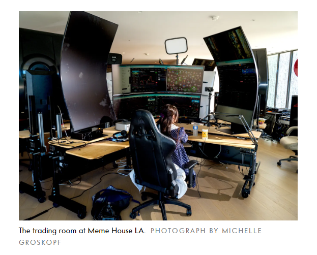 What were doing is simplifying trading terms, Watson says. But were using the language Gen Z already speaks. Downstairs, in a room of wall-to-wall windows overlooking dusty canyons sloping out to the Los Angeles skyline, four traders sit before massive monitors. The screens are filled with charts and numbers. It looks like a tiny Wall Street trading floor with a patio bar and infinity pool attached. Webcams are fixed on the traders, livestreaming to an invisible online audience. Theres a DJ. Welcome to Meme House LA.