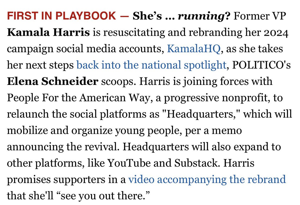 The former vice president and 2024 Democratic presidential nominee on Thursday rebooted the KamalaHQ account, which has over 1 million followers on X and more than 5 million on TikTok, as just Headquarters, which in a partnership with the left-leaning People for the American Way shes calling an online organizing project for next generation campaigning.