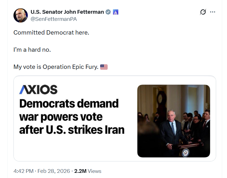 next week reining in Trump's war powers.https://www.axios.com/2026/02/28/iran-trump-strikes-congress-democrats-israel