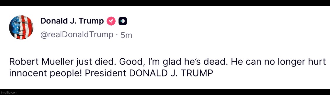 Robert Mueller just died. Good, Im glad hes dead. He can no longer hurt innocent people! President DONALD J. TRUMP
