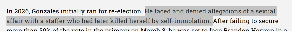 In 2026, Gonzales initially ran for re-election. He faced and denied allegations of a sexual affair with a staffer who had later killed herself by self-immolation. After failing to secure more than 50% of the vote in the primary on March 3, he was set to face Brandon Herrera in a runoff scheduled for May 2026. On March 4, Gonzales admitted to the affair, dropping his re-election campaign amid pressure from party leadership the following day. On April 13, 2026, he announced he will leave Congress.