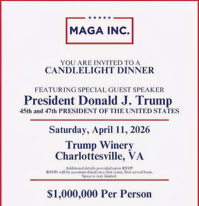 As the week drew to a close, Trump jetted off on Friday to a $1 million-per-person fundraiser at the Trump Winery in Charlottesville, Virginia. The invitations for the event billed it as a “Candlelight Dinner” with a hefty pricetag: