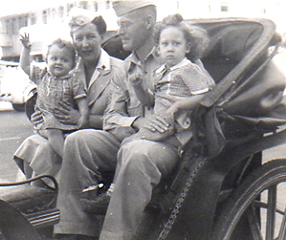 This 1944 photo is of baby me, my sister Veronica, our father U.S. Army sergeant James Austen, and our first meeting with American Red Cross volunteer Mary McGeoch. We were in Karachi, India (now Pakistan) on our way to board a Coast Guard troop transport ship that would take us on a 2-month-long journey to America. Veronica and I were born in India. Our Anglo Indian mother had died of illness there when I was 3 weeks old, and Dad, who was scheduled to return to America, arranged for Veronica and me to accompany him on the ship. He would be on active duty, so Mary, who was planning to return home to New York on leave, volunteered to care for my sister and me on the trip. Soon after our arrival in America, she and Dad married, and Mary became our new mother - and what a wonderful mom she was.