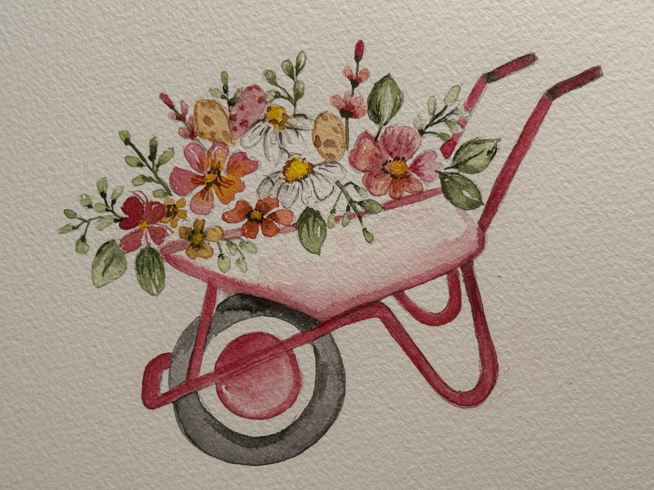 (6,188 posts)Theres something really appealing to me about this whole composition, especially the center daisy and the 7 green leaves over the crisp red lines of the barrow and the gracefully soft grays of the wheel.