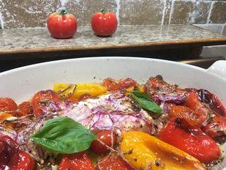 I place the block of feta in the middle and surround it with red and yellow peppers, 4 cloves garlic, cherry tomatoes, olive oil, oregano, thyme, and fresh basil. I zest a lemon and mix it with olive oil and the herbs and pour it over the peppers and feta, which are on a sheet pan. Then I roast it.