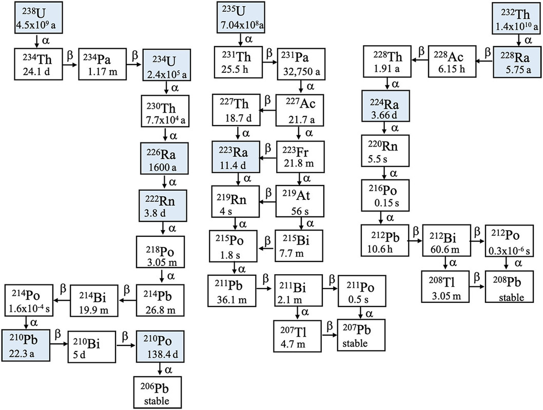 It begins in the chain on the left, 238U at 226Ra, the only isotope of radium that can be isolated in visible amounts. (The half-life in the diagram, 1600 years, is involved in the definition of the nonstandard unit, still in use, the Curie, which is now defined as exactly 3.7 X 1010 nuclear decays per second per gram.